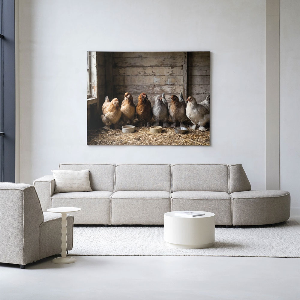 Breng de landelijke charme in huis met dit luxe glasschilderij van zes karaktervolle kippen. De warme aardetinten en zachte grijstinten van de veren komen op het geharde glas prachtig tot leven. Dankzij de glanzende afwerking krijgen de natuurlijke kleuren een diepe, rijke uitstraling. Een sfeervolle blikvanger die door zijn rustige kleurgebruik perfect past in elk landelijk of modern interieur.