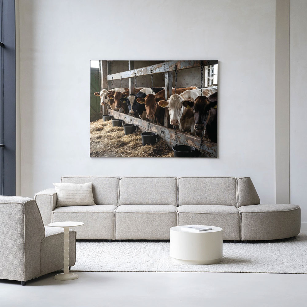 Breng de gezelligheid van de boerderij direct naar je woonkamer. Op dit mooie glasschilderij staan zes nieuwsgierige koeien die je recht aankijken. Het glas glanst prachtig en zorgt ervoor dat de kleuren en details heel echt lijken. Het is een stoere en luxe decoratie die perfect past bij een landelijk huis. Een echte blikvanger die je interieur meteen sfeer geeft!