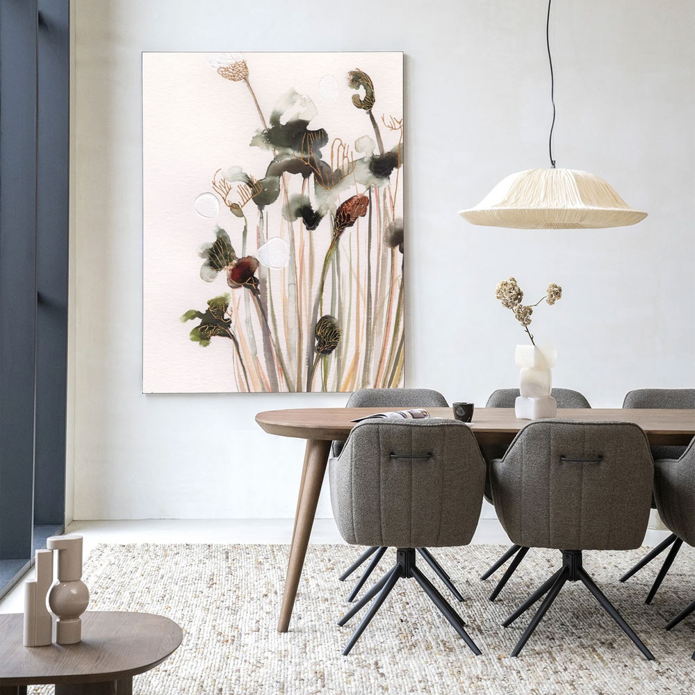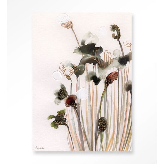Dit kunstwerk van Anick de Rouw combineert delicate aquareltechnieken met natuurlijke vormen. Zachte pasteltinten en gedetailleerde gouden accenten brengen de bloemen en stelen tot leven, met een verfijnde, dromerige uitstraling. Een perfecte aanvulling voor een licht en modern interieur. De kunst weerspiegelt de rust van de natuur en voegt een kalme, artistieke sfeer toe aan elke ruimte.