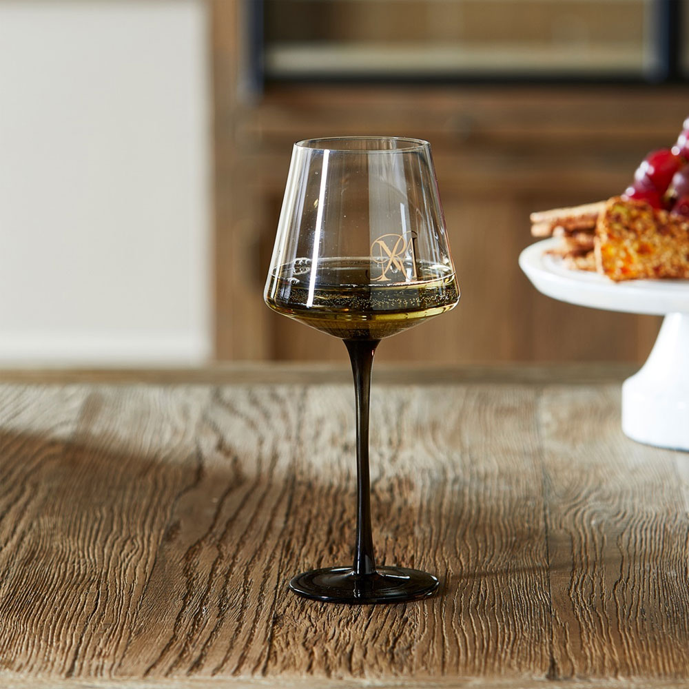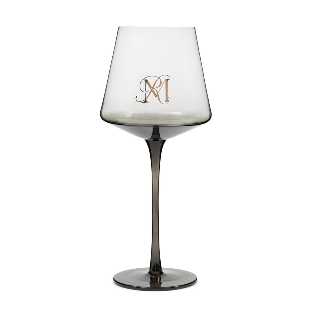 Dit witte wijnglas van donker glas combineert een verfijnd ontwerp met een luxe uitstraling. Het gouden RM-logo op de voet geeft een exclusieve touch, waardoor het glas een stijlvolle aanvulling is op elke tafelsetting. Ideaal voor het serveren van witte wijn en perfect om je favoriete dranken elegant te presenteren. Voeg een vleugje glamour toe aan iedere gelegenheid en geniet van een verfijnde wijnervaring.