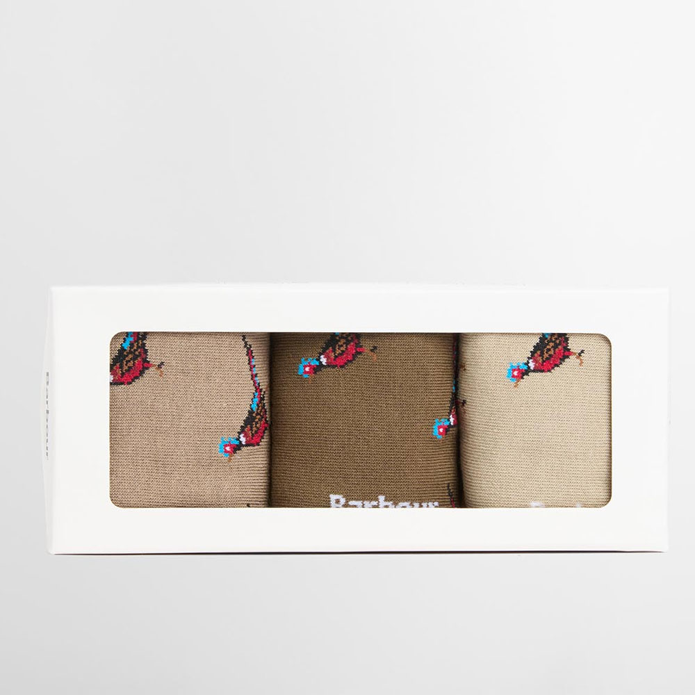 De Barbour Pheasant sokkenset is het perfecte cadeau voor elke liefhebber van het platteland en de natuur. De set bestaat uit drie hoogwaardige sokken van katoen in verschillende kleuren, elk met een herhalend fazantenmotief. Deze charmante set wordt geleverd in een doos met het Barbour-logo, zodat u hem gemakkelijk cadeau kunt doen.