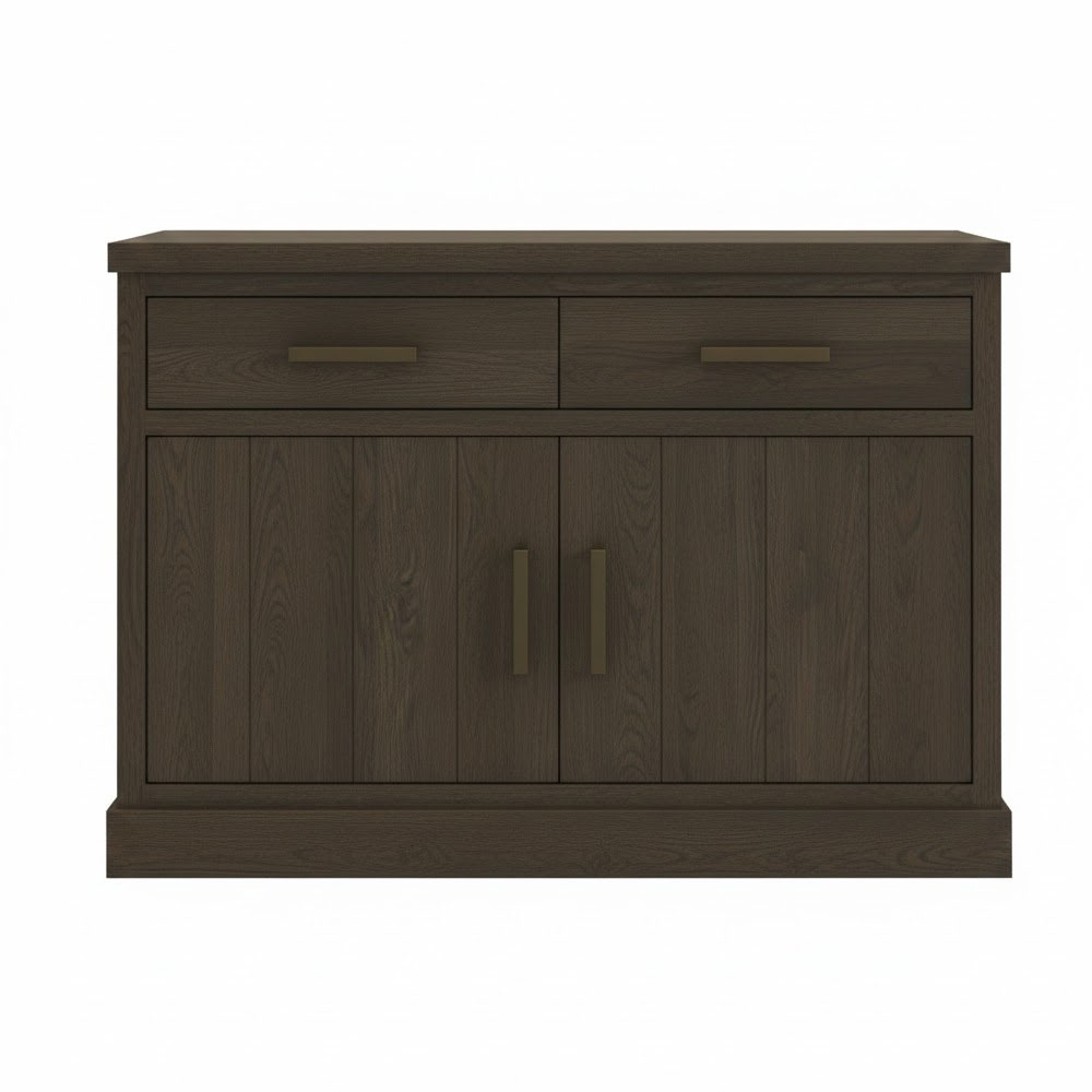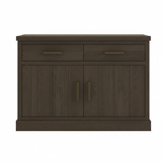 Zoekt u een meubelstuk dat maximale opbergruimte biedt zonder veel vloeroppervlak in te nemen? Dit compacte dressoir combineert het warme, rustieke karakter van donker eikenhout met een slimme indeling van lades en deuren. Perfect voor kleinere ruimtes, de hal of als stijlvolle aanvulling in uw eetkamer