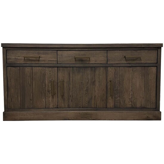 Breng in één keer warmte en functionaliteit in huis met dit stoere dressoir in landelijke stijl. Vervaardigd uit premium eikenhout en afgewerkt in een diepe, donkere tint. De deuren zijn voorzien van een verfijnd verticaal lijnenspel, wat het meubel een karaktervolle, handgemaakte look geeft. Het dressoir beschikt over twee royale opbergvakken, bereikbaar via vier deuren met slanke handgrepen in een elegante messingkleur. Ideaal voor zowel de woon- als eetkamer. Een duurzaam pronkstuk dat jarenlang een stijlvolle toevoeging aan uw interieur zal blijven.