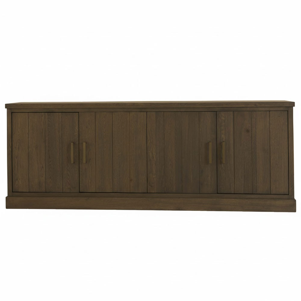 Creëer direct sfeer en opbergruimte met dit robuuste, landelijke dressoir. Gemaakt van hoogwaardig eikenhout met een rijke, donkere afwerking. Het verticale lijnenspel op de deuren geeft de kast een unieke, ambachtelijke uitstraling. Voorzien van twee ruime kasten, afgesloten door vier deuren met elegante, slanke messing-kleurige handgrepen. Perfect voor zowel de woonkamer als de eetkamer. Een meubelstuk dat jarenlang de blikvanger in uw interieur zal zijn.