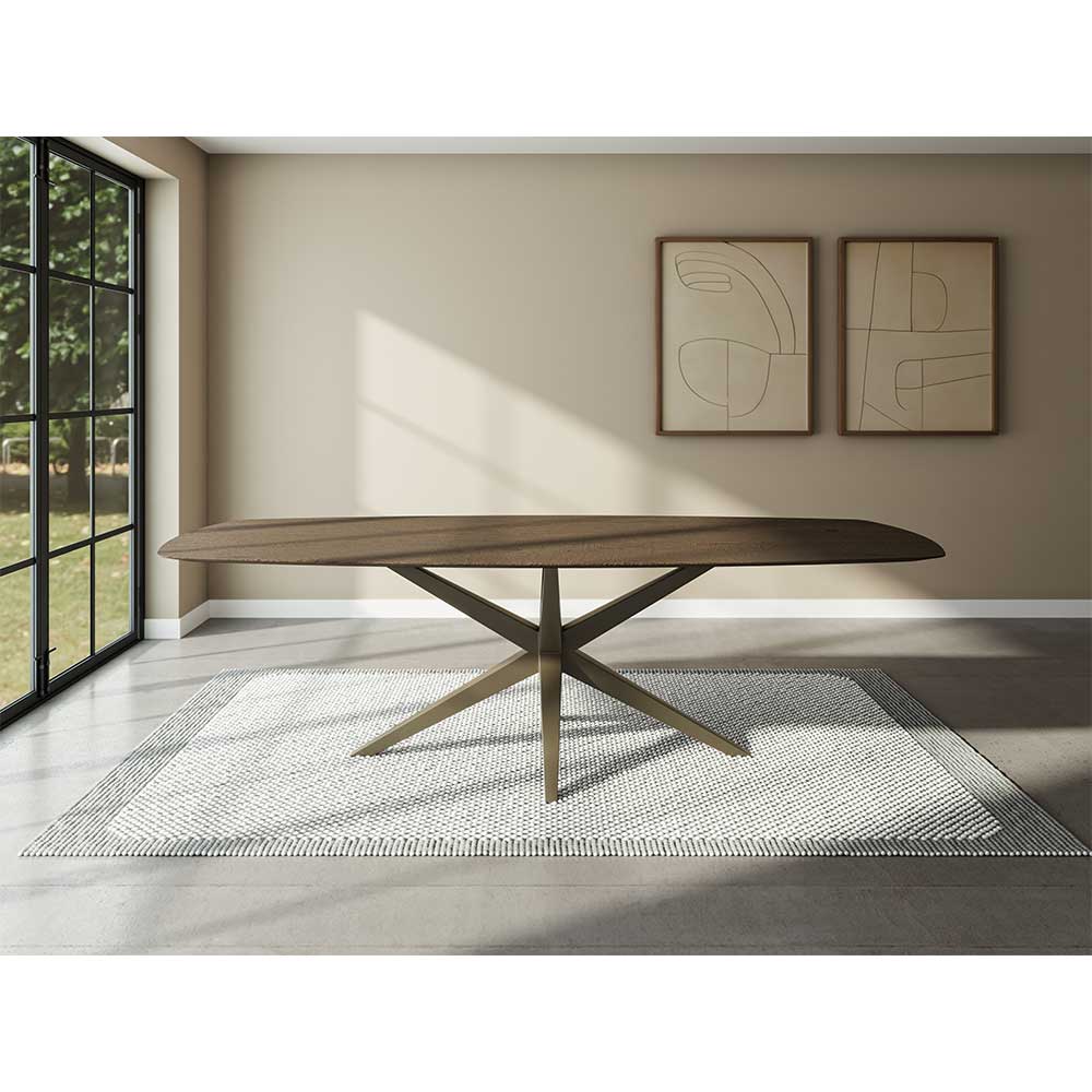 Bent u op zoek naar het perfecte middelpunt voor uw interieur? De eettafel Deventer combineert organische vormen met een mooi metalen onderstel in de warme tint anodic brown. Dankzij de unieke verjongde bladrand en het iconische onderstel is deze tafel niet zomaar een meubelstuk, maar een designobject dat rust en klasse uitstraalt.