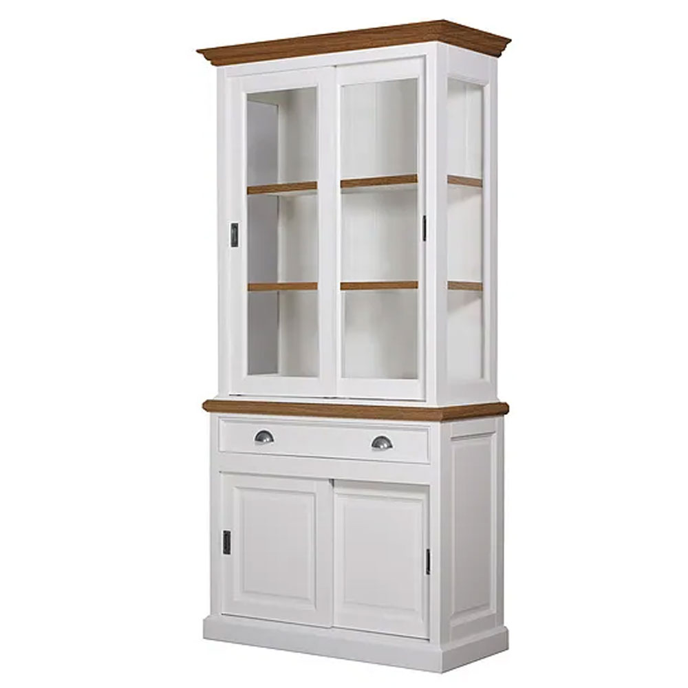 Smalle landelijke vitrinekast, de kast is voorzien van schuifdeuren op een aluminium rails voor optimaal gebruik, de laden zijn voorzien van softclose.