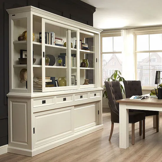 Royale vitrinekast, de kast is voorzien van schuifdeuren op een aluminium rails voor optimaal gebruik, de laden zijn voorzien van softclose.
