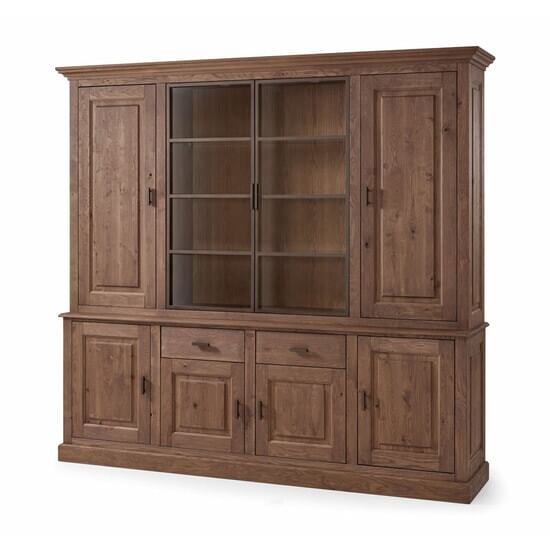 De warme, natuurlijke houttint benadrukt de unieke nerfstructuur van het eikenhout en maakt van elke kast een uniek stuk. Dankzij de combinatie van open vakken, glazen deuren en gesloten opbergruimte biedt Emma zowel een decoratief als praktisch element in jouw woonruimte.