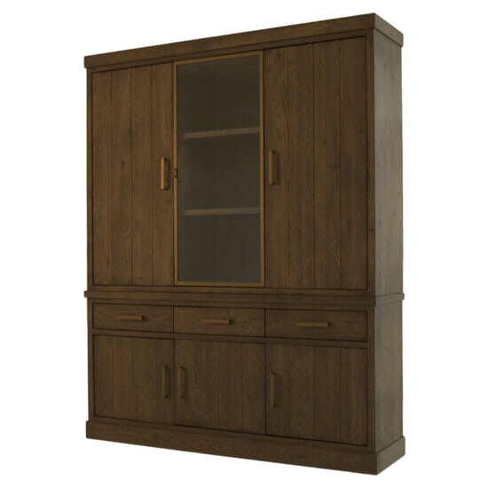 Vervaardigd uit kwalitatief hoogwaardig hout en afgewerkt in een rijke, warme tint, ademt deze kast een gevoel van verfijnde luxe. De subtiel verticale houtnerven versterken het natuurlijke en stijlvolle uiterlijk, terwijl de stevige messingkleurige handgrepen en de elegante omlijsting rond de glazen schuifdeuren zorgen voor een moderne, luxueuze uitstraling.