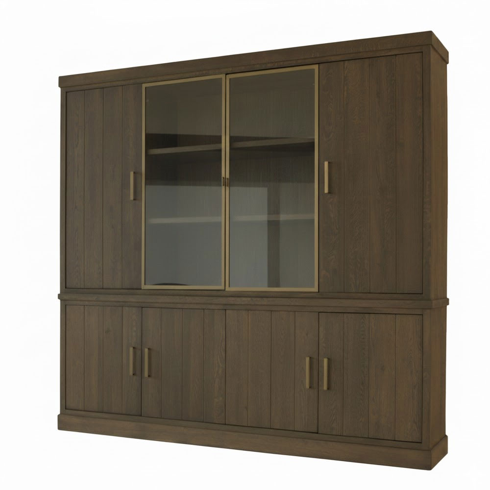 Gemaakt van hoogwaardig hout en afgewerkt in een warme, diepe tint straalt deze kast pure elegantie uit. De subtiele verticale houtstructuur geeft het geheel een verfijnde en natuurlijke uitstraling, terwijl de solide messingkleurige handgrepen en de sierlijke omlijsting rondom de glazen schuifdeuren een moderne, luxe touch toevoegen.