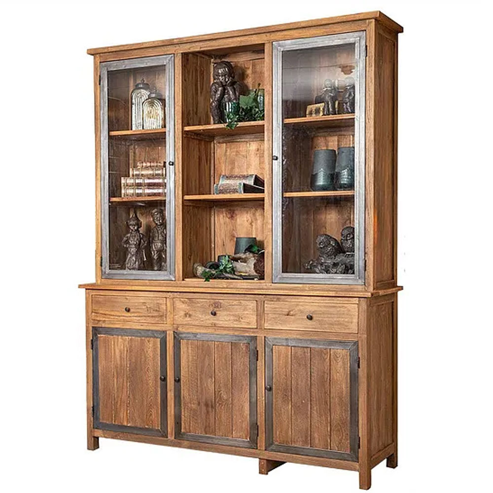 Stoere en landelijke industriële winkelkast, kast is voorzien van metalen frame rondom de dichte- en glasdeuren.