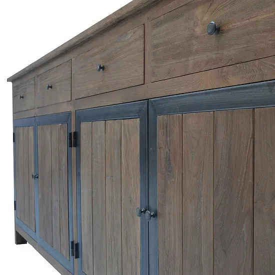 Stoere en landelijke industriële winkelkast, kast is voorzien van metalen frame rondom de dichte- en glasdeuren.