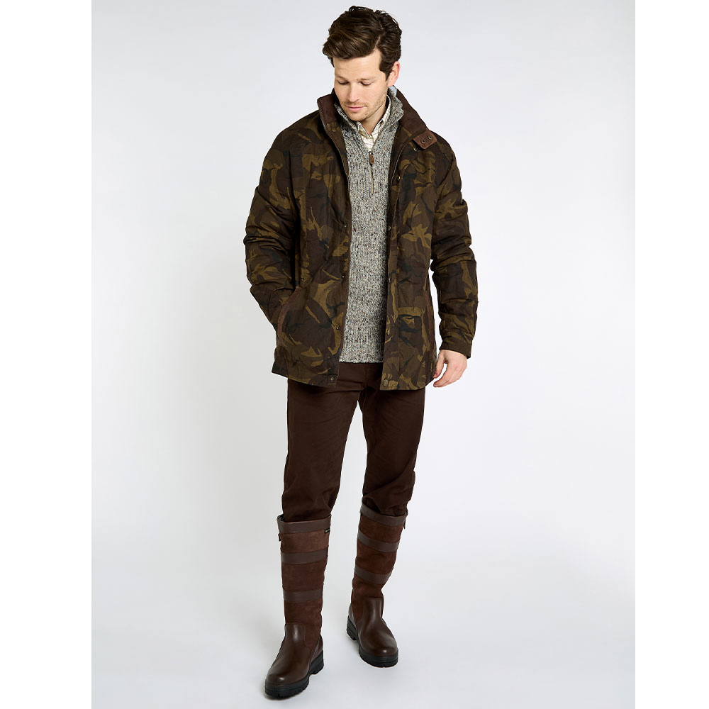 Dit sportieve, korte wax jacket van Dubarry heeft opvallende details in bruin leder; langs de kraag en zakken.