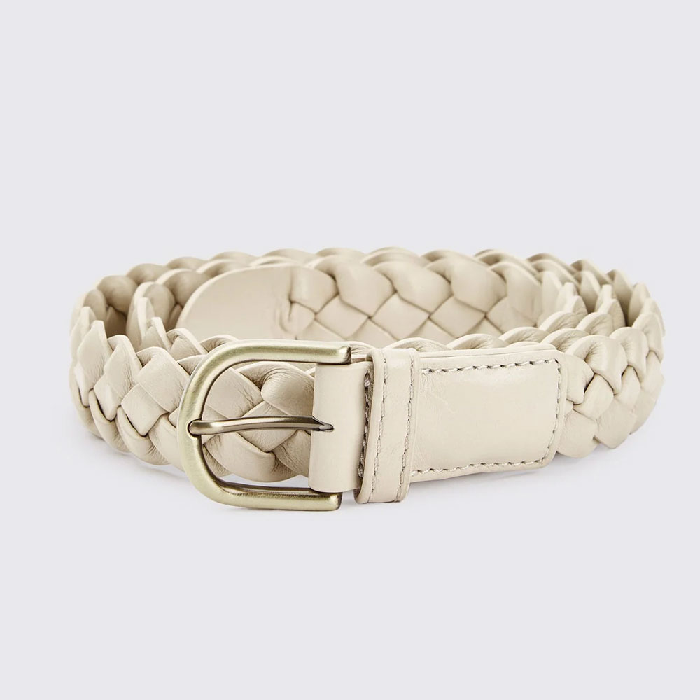 Deze gevlochten riem van soepel leer straalt klasse en verfijning uit. De unieke vlechtstructuur geeft de riem een subtiele textuur en een speelse uitstraling, waardoor hij zowel bij casual als formele outfits perfect tot zijn recht komt.