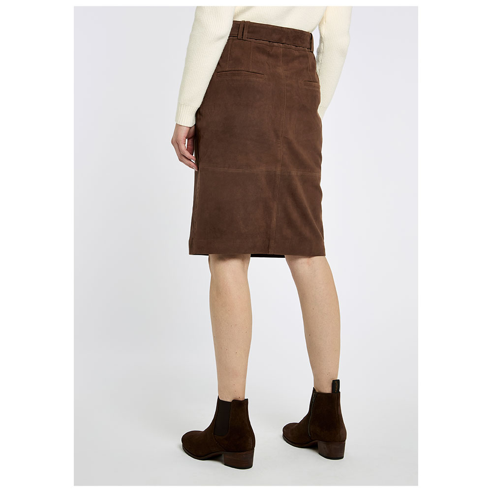Een tijdloze toevoeging aan je capsule wardrobe: de Sullivan rok is ontworpen met oog voor detail en gemaakt van soepel geitensuède in een warme walnootkleur. De knielange lengte, elegante plooien en verfijnde afwerking maken dit een item dat je seizoen na seizoen met plezier draagt.