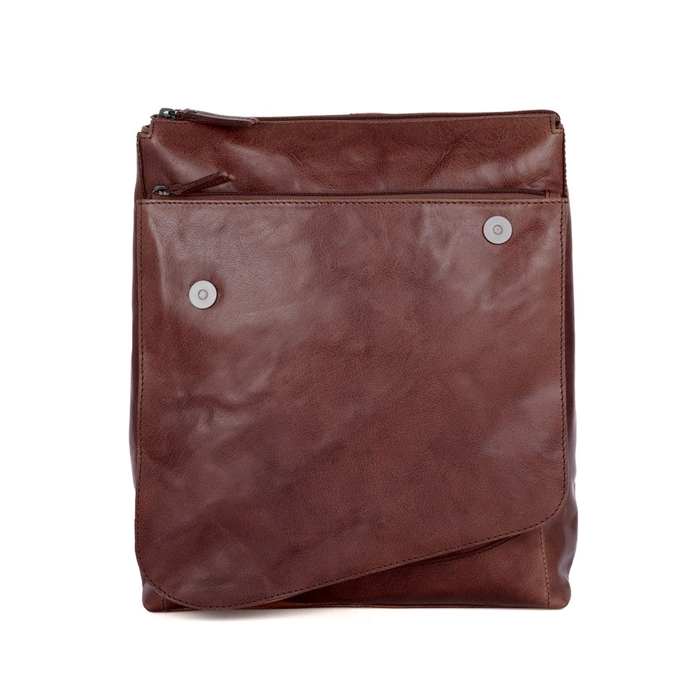 Exterieur: verborgen voorvak met rits, hoofdvak met rits en flap met magneetsluiting, achtervak met rits