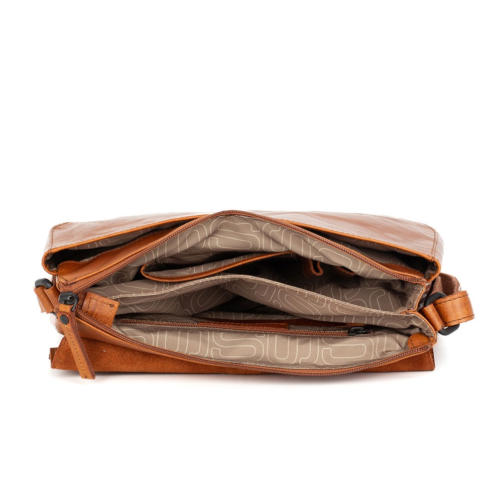 Exterieur: hoofdvak met flap en magneetsluiting, verborgen insteek voorvak, achtervak met rits