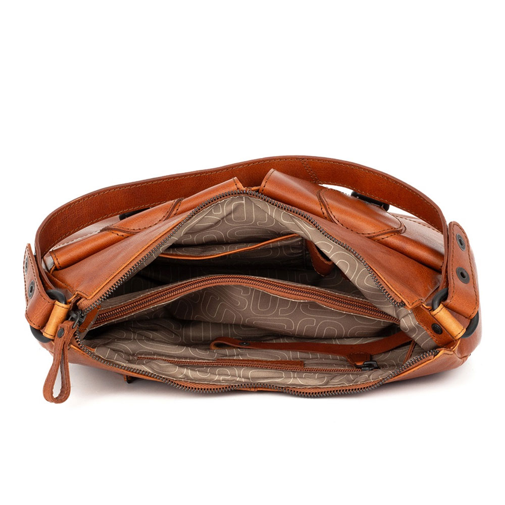 Kleur: Brandy Afmeting: 32,5 x 9 x 21 cm Materiaal: Bronco leer Exterieur: 2 voorvakken met flap en magneetsluiting, hoofdvak met rits, achtervak met rits Interieur: ritsvak, tussenschot met rits, insteekvak, 2 pennenlusjes, sleutellusje Hengsels en banden: korte en lange afneembare/verstelbare schouderband