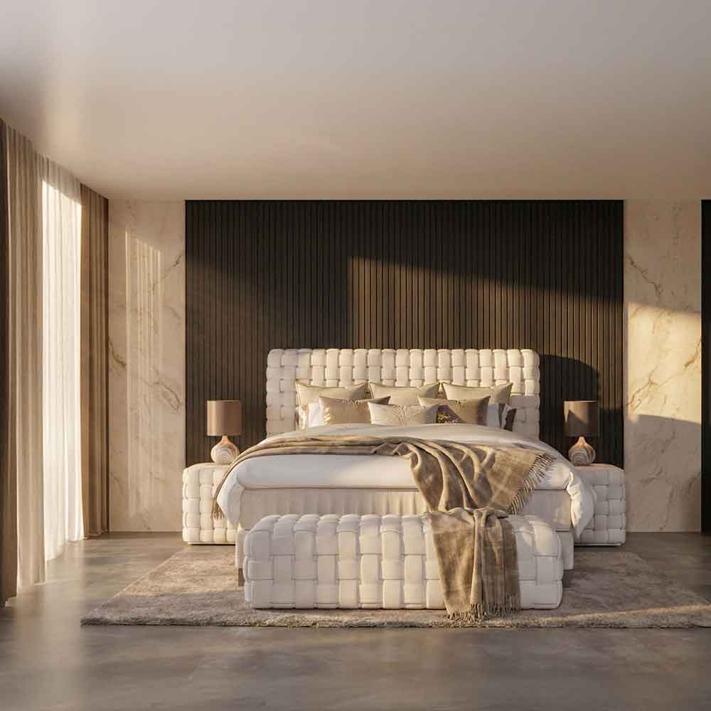 De Chess luxe boxspring is voor wie durft. Met zijn unieke, met de hand gevlochten hoofdbord haal je geen meubel, maar een meesterwerk in huis. Exclusief, karaktervol en speciaal ontworpen voor de trendsetter die weigert genoegen te nemen met het gewone. Neem contact op om dit model te bezichtigen.