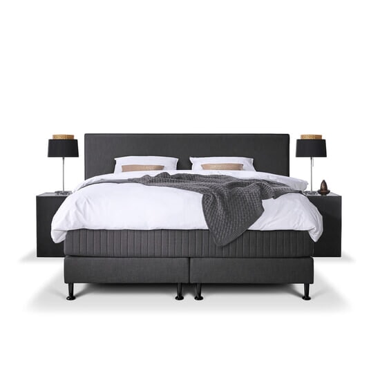 Het super strakke en rechte hoofdbord creëert een geheel eigen uitstraling. Gestoffeerd in de elegante Mine stof, geeft deze boxspringcombinatie een luxe gevoel en een warme, uitnodigende uitstraling. Tegelijkertijd blijft het trendy door de stijlvolle bies in de afwerking. Wat u op de foto ziet, staat ook bij u thuis, precies zoals afgebeeld.