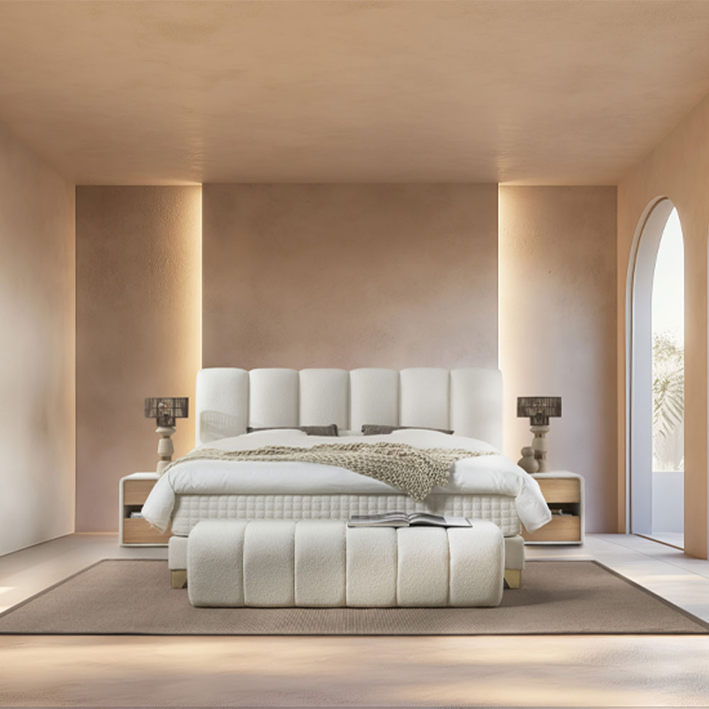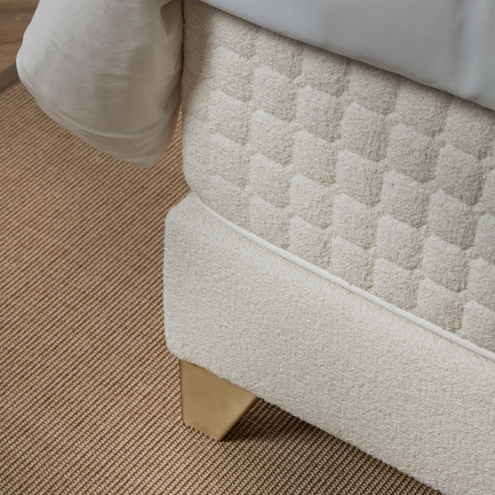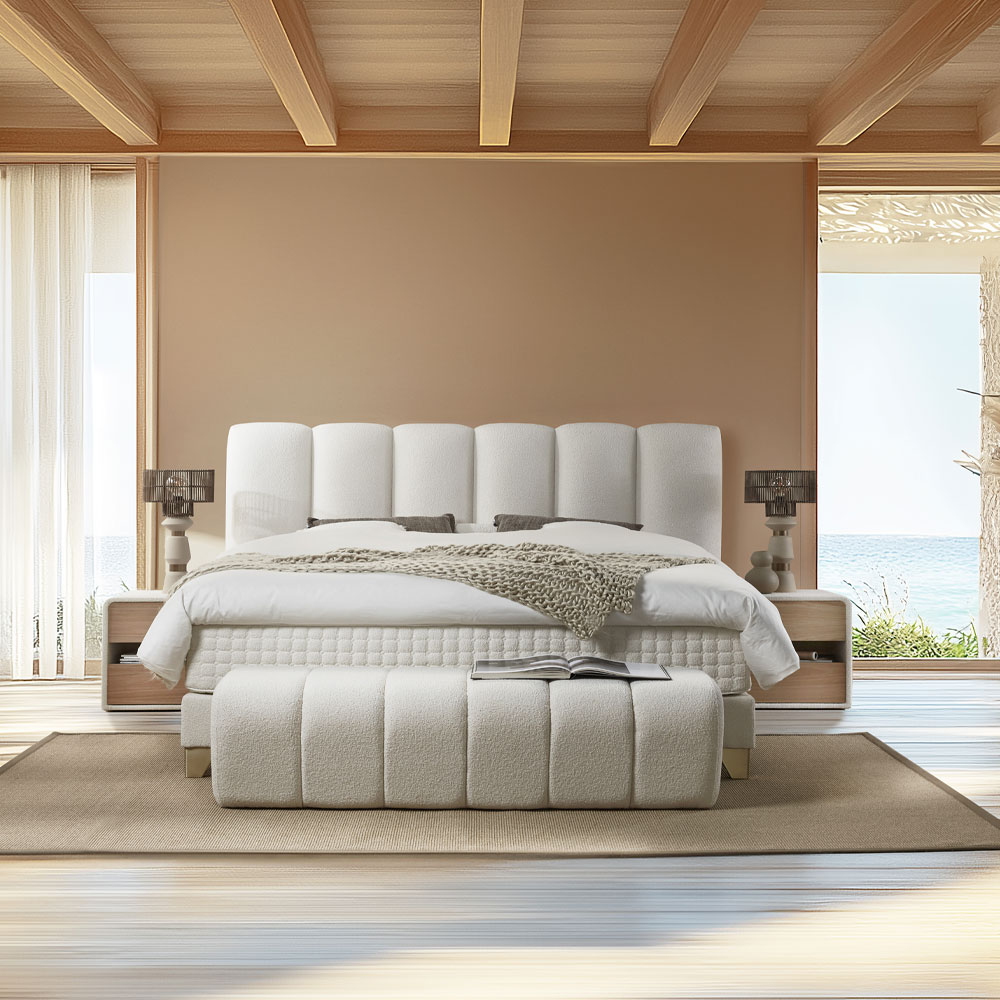 Breng de ontspannen, stijlvolle sfeer van Ibiza naar je slaapkamer met de Serta Ibiza Premium. Deze luxe boxspring is afgewerkt met een gewatteerd, golvend hoofdbord en bekleed met zachte Nobu White bouclé voor een verfijnde, bohemian-chique uitstraling.