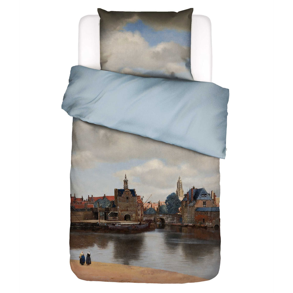 Dit Essenza dekbedovertrek View on Delft brengt een meesterwerk van Johannes Vermeer naar je slaapkamer. Het wereldberoemde schilderij Gezicht op Delft, te zien in het Mauritshuis, is natuurgetrouw vertaald naar textiel. De zachte, grijzige blauwtint geeft de print een kalme, tijdloze uitstraling die uitnodigt tot verstilling.