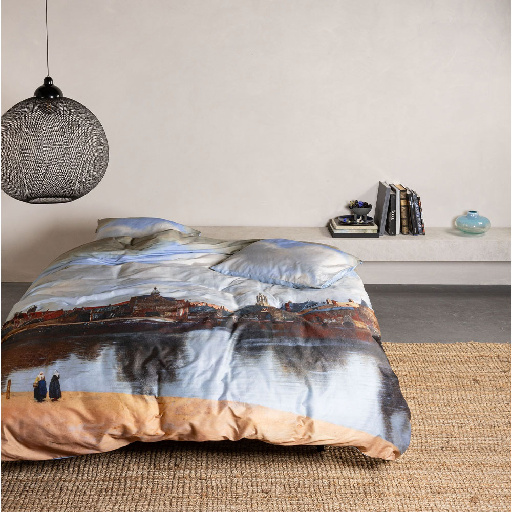 Dit Essenza dekbedovertrek View on Delft brengt een meesterwerk van Johannes Vermeer naar je slaapkamer. Het wereldberoemde schilderij Gezicht op Delft, te zien in het Mauritshuis, is natuurgetrouw vertaald naar textiel. De zachte, grijzige blauwtint geeft de print een kalme, tijdloze uitstraling die uitnodigt tot verstilling.