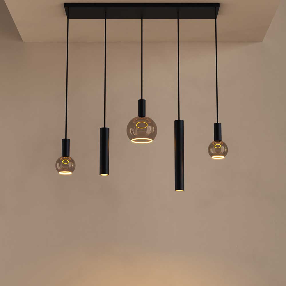 Let op: de prijs van deze hanglamp is exclusief glazen kappen, zodat je de lamp volledig naar wens kunt samenstellen. meerprijs €225
