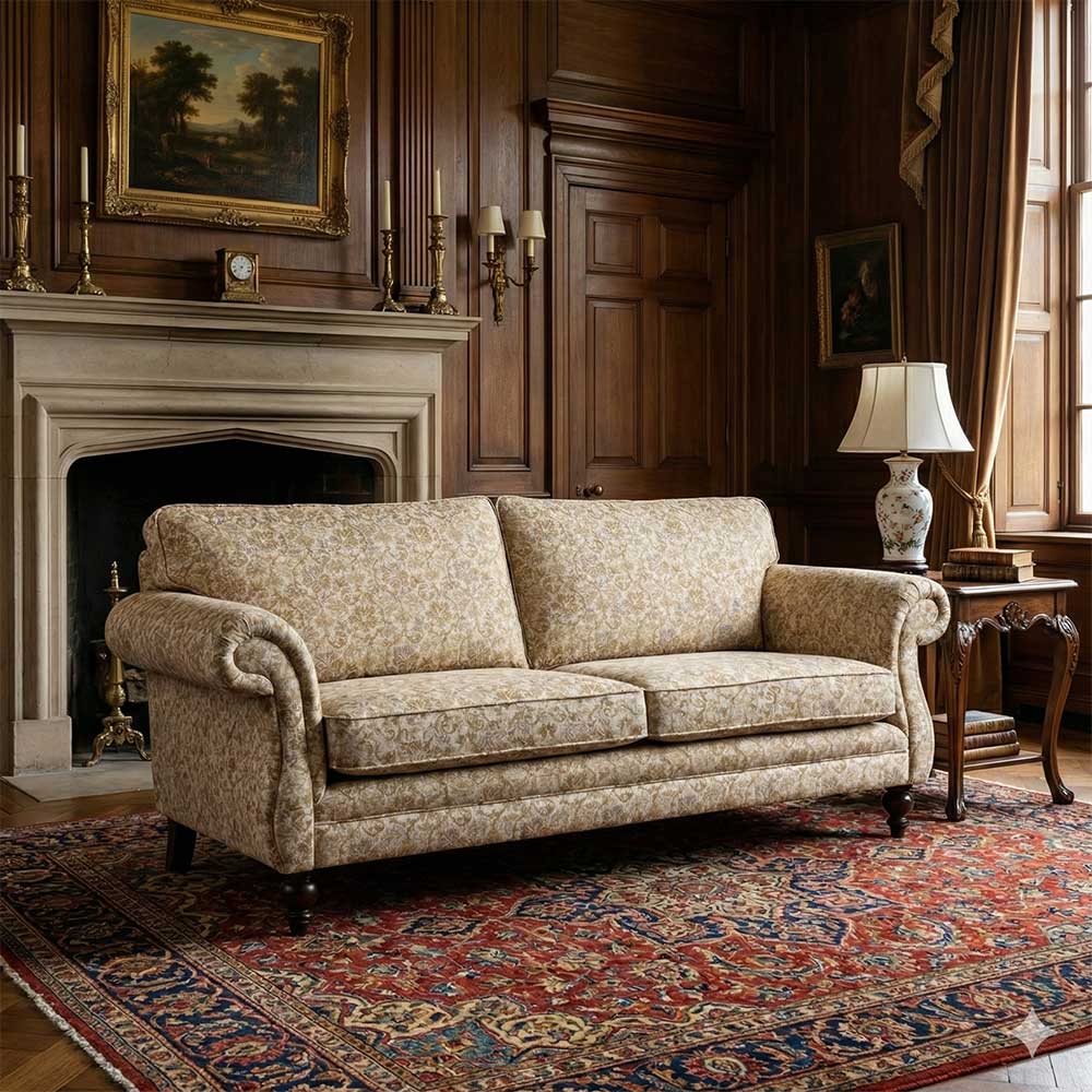 Door de bank te bekleden in een bloemstof krijgt de bank een mooie Engelse uitstraling.