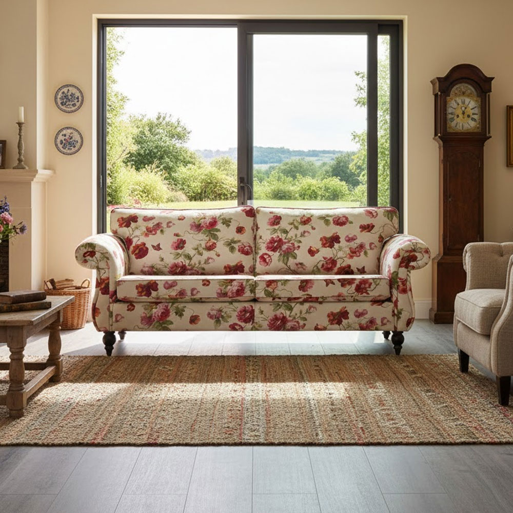 Door de bank te bekleden in een bloemstof krijgt de bank een mooie Engelse uitstraling.