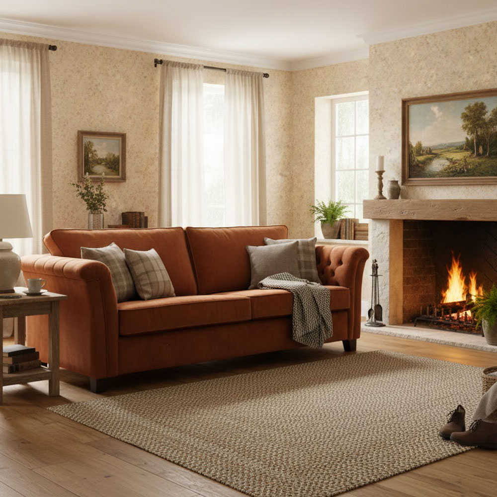 Landelijke romantische bank voorzien van gecapitonneerde armleuningen. Zitkussens zijn gevuld met koudschuim wat zorgt voor een stevige zitting. Ook leverbaar met latex vulling.