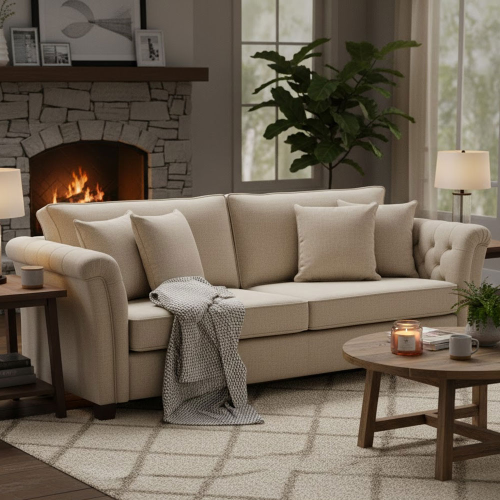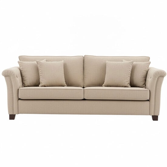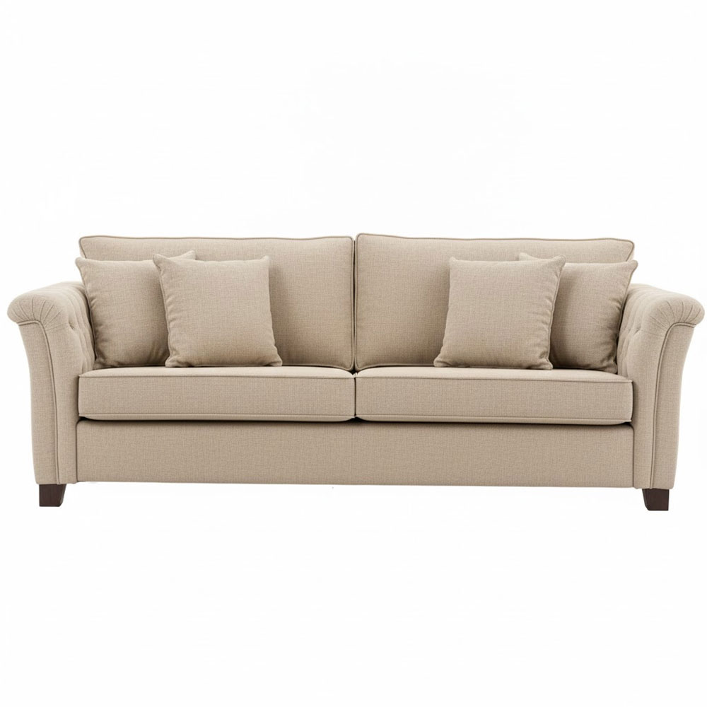 Landelijke romantische bank voorzien van gecapitonneerde armleuningen. Zitkussens zijn gevuld met koudschuim wat zorgt voor een stevige zitting. Ook leverbaar met latex vulling.
