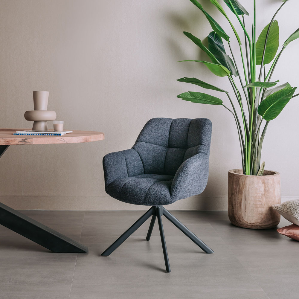 Eetkamerstoel Alba staat voor comfort en karakter in een tijdloos jasje. U stelt de stoel zelf samen, van bekleding tot onderstel, zodat hij naadloos past in uw interieur. Functioneel, stijlvol en volledig naar uw wensen ontworpen.