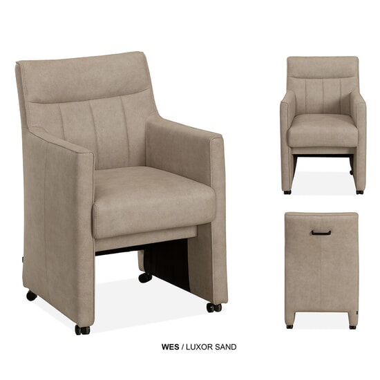 Voeg een moderne touch toe aan uw eetruimte met onze eetkamerstoel met armleuningen en wielen. De zwarte handgreep op de rug voegt een stijlvolle en praktische touch toe. Verkrijgbaar in diverse kleuren om perfect bij uw interieur te passen.