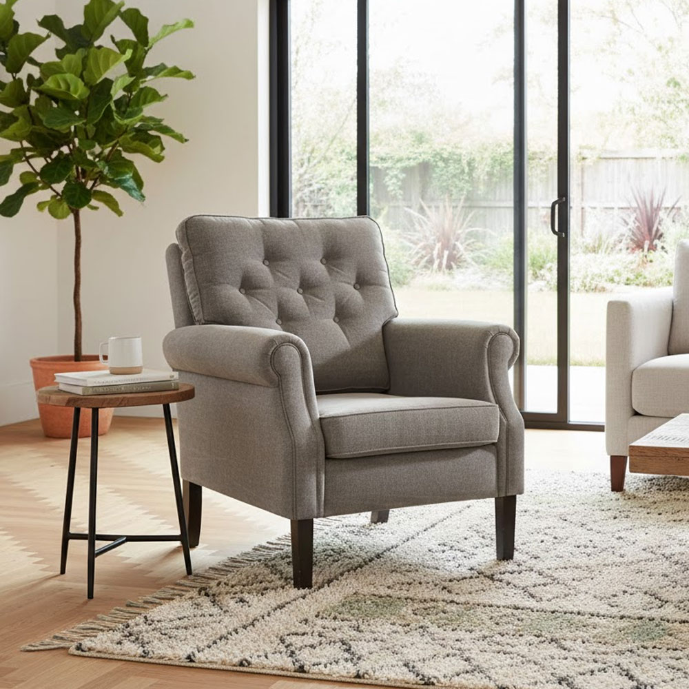 Landelijke fauteuil met sierknopen in de rug, een comfortabele vulling voor ultiem zitcomfort.