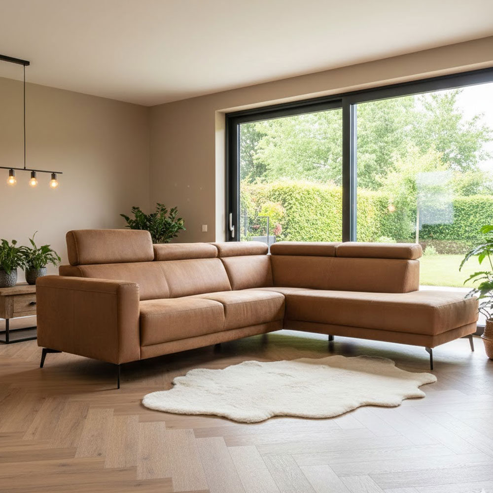 Moderne hoekbank met strakke lijnen en klapbare hoofdsteunen. Deze hoekbank kan je samenstellen in diverse opstellingen en materialen.
